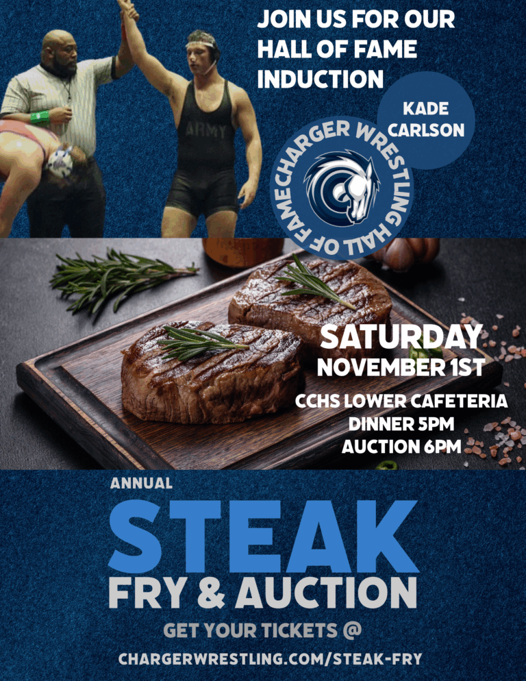 3rd Annual Steak Fry & Auction Tickets available for $25 Steak Fry Ticket quantity Add to Cart ALL Proceeds go to Charger Wrestling club to support our athletes Saturday November 1stDinner will begin at 5pmAuction will begin at 6pmThis event will take place in the Corner Canyon lower lunch room. Come support Charger Wrestling, have a great dinner, and celebrate Kade Carlson